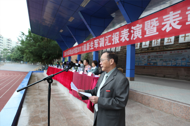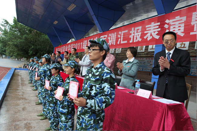 9月19日上午,beat3652011级学生军训总结大会在田径场隆重举行。参加军训的同学们以整齐的军容和 昂扬的士气,向学校和承训部队领导展示了军训的成果。校长沈清淮,副校长周及至,副校长黎明,校长助理白成良,中国人民武装警察部队重庆总队 第七支队指导员隗功明,学校相关部门负责人,以及学校董事王成玮先生、韩玉军先生及2011级全体辅导员出席了总结大会,全体承训官兵及2011级全体学生参加了军训总结大会,会议由校长助理白成良主持。