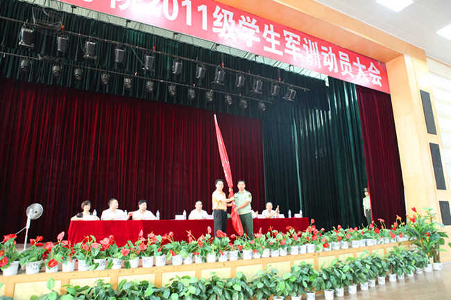 黎明副校长代表学校向承训部队授了军旗,意味着2011级军训正式拉开帷幕。