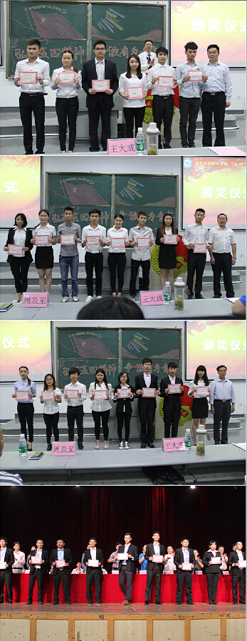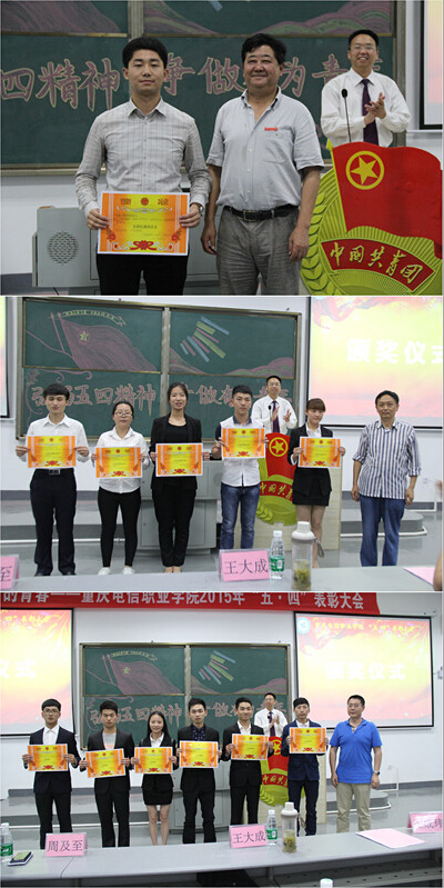 值“五·四”运动96周年之际,为进一步弘扬“五四”精神,宣传和表彰在过去一年里为学校和共青团工作做出突出贡献的集体和个人。5月14日、17日,beat365分别在龙水湖校区第一阶梯教室、卫星湖校区活动中心四楼举行了“奋斗中的青春—beat365手机版官方网站2015年‘五·四’表彰大会”。校领导王大成、周及至、王成玮、白成良、钟代军、殷朝华,校务部、教工部、星湖运行管理处、学工部等部门负责人出席大会,并为获奖集体和个人代表颁奖。各二级学院党政领导、团总支书记、辅导员及教师和学生代表近2000人参加了此次表彰大会。大会由党委副书记、副校长白成良主持。
