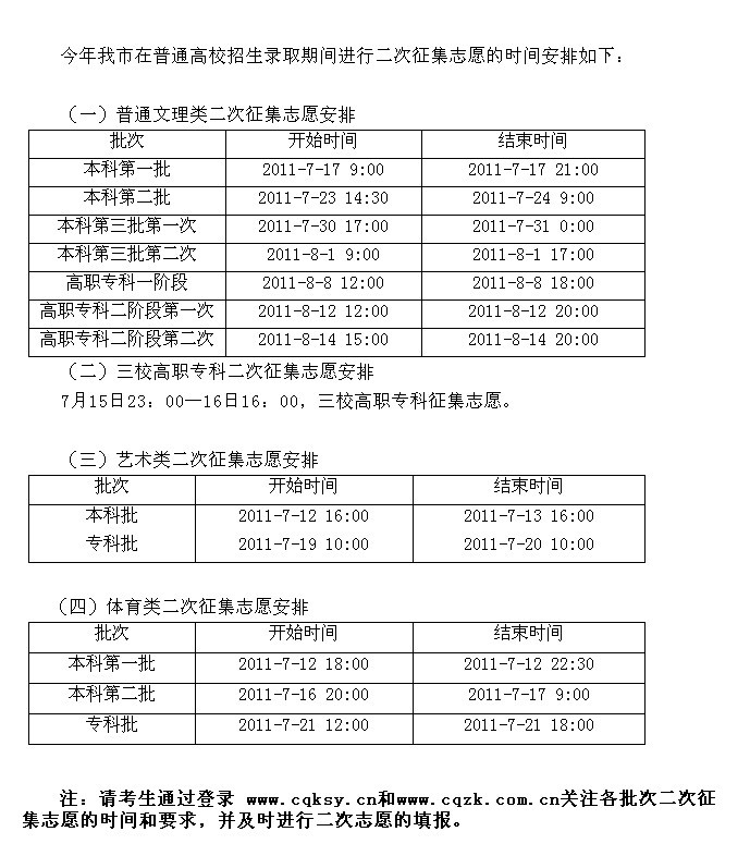 重庆2011年普通高校招生二次征集考生志愿的时间安排
