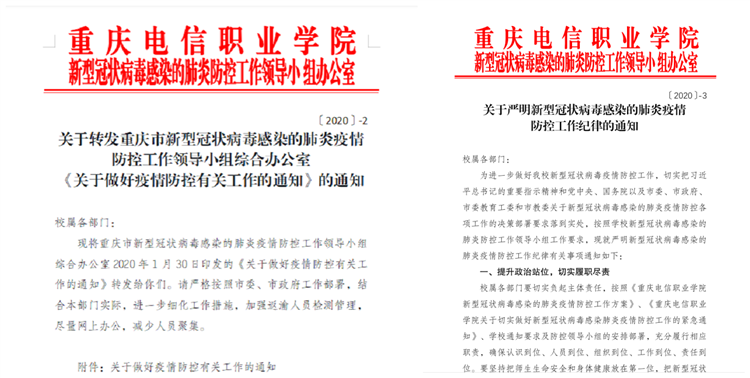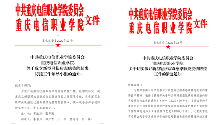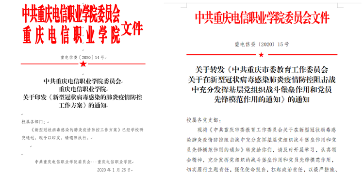 1月30日,学校印发《关于切实加强2020届顶岗实习学生疫情防控工作的通知》,加强与实习学生的联系,启动暂停顶岗实习工作;转发《中共重庆市委教育工作委员会关于在新型冠状病毒感染肺炎疫情防控阻击战中充分发挥基层党组织战斗堡垒作用和党员先锋模范作用的通知》,号召各级党组织和党员同志充分发挥党组织的战斗堡垒作用和党员先锋模范作用,切实履行主题责任,强化使命担当,扛起政治责任。