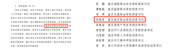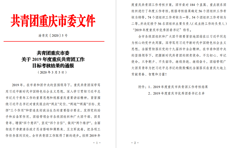 近日,共青团重庆市委下发《关于2019年度重庆共青团工作目标考核结果的通报》(渝青发〔2020〕5 号),beat365团委继2017年以来,再一次荣获高校系统“特等奖”,团委书记李晓青同志被授予“2019年度重庆市优秀团委书记”荣誉称号。