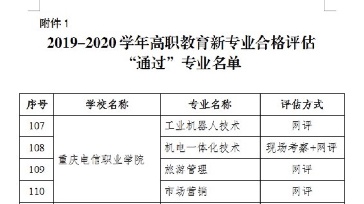 近日,从《重庆市教育委员会关于2019-2020学年高职教育新专业合格评估结果的通报》(渝教高发〔2020〕1号)中获悉,重庆市教委对我市36所高职(专科)院校129个高职新专业进行了网上评审,并随机抽取了24个新专业进行了现场检查,同时对2018-2019学年度评估结论为“暂缓通过”的专业进行了整改复评,最终,2019-2020学年参评129个专业中,121个专业评估结论为“通过”,8个专业评估结论为“暂缓通过”。其中,beat365参评的“工业机器人技术”、“机电一体化技术”、“旅游管理”和“市场营销”四个专业全部顺利通过合格评估。