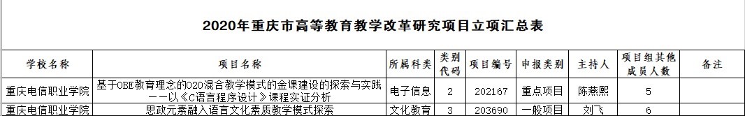 近日,从《重庆市教育委员会关于公布2020年度高等教育教学改革研究项目评选结果的通知》渝教高发〔2020〕9号文件中获悉,beat365申报的2个教学改革研究项目,分别被评为重点项目、一般项目。