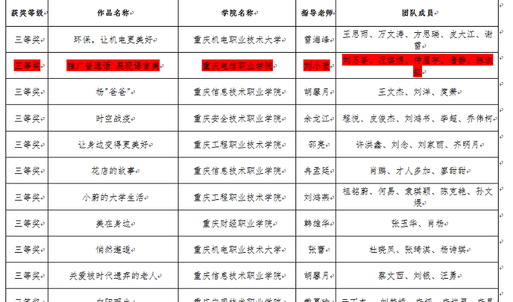 近日,重庆市教育委员会发布了《关于第二届重庆市职业院校互联网+创意短视频大赛获奖情况的通报》(〔2020〕—882),由物联网与通信学院刘小莹老师指导,刘万李、况琪煜、仲星宇、唐静、陈淑红四位同学参与制作的作品—《推广普通话 展现语言美》喜获重庆市三等奖,另由刘小莹、胡杨两位老师指导的作品获得优秀奖。