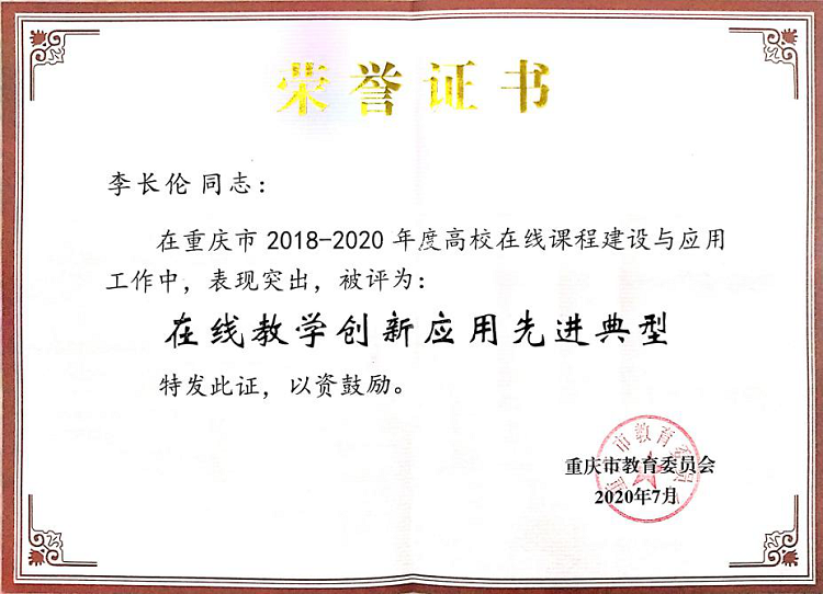 近日,从《重庆市教育委员会关于公布2018-2020年度高校在线课程建设与应用先进典型名单的通知》(渝教高发〔2020〕15号)中获悉,beat365李长伦老师师获评2018-2020年度高校在线课程建设与应用先进典型。