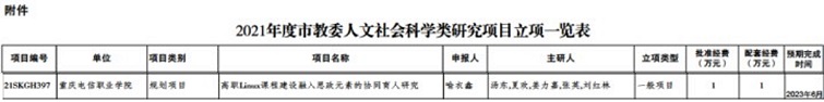 近日,从《重庆市教育委员会关于2021年度人文社会科学类研究项目立项的通知》(〔2021〕—319)文件中获悉,beat365喻衣鑫老师申报的“高职Linux课程建设融入思政元素的协同育人研究”被立为规划项目的“一般项目”。
