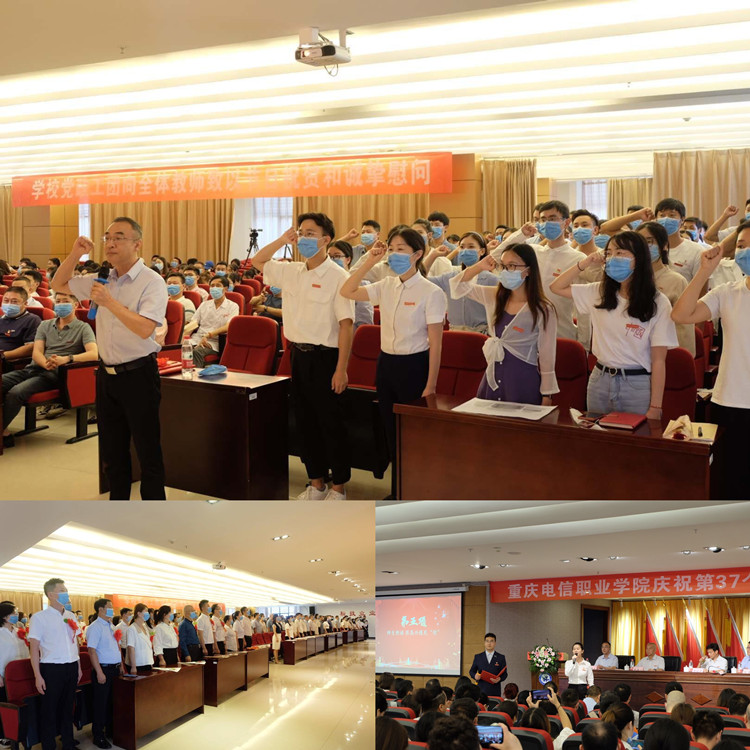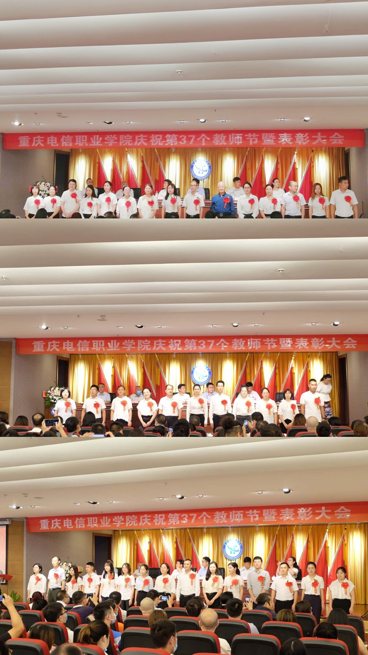 大会在庄严的国歌声中拉开帷幕。会上,党委书记张勇刚宣读了《中共重庆市委教育工作委员会关于表彰教育系统优秀共产党员、优秀党务工作者和先进基层党组织的决定》《中共重庆市委教育工作委员会关于公布重庆市新时代高校党建示范创建和质量创优工作培育创建名单的通知》《beat365手机版官方网站关于表彰第37个教师节先进集体、优秀个人的决定》和《beat365手机版官方网站关于颁发在校工作十年证书的决定》,会上为重庆市新时代高校党建“双创”样板支部——人工智能与电子学院党支部授牌,为重庆市教育系统优秀共产党员文水兵同志颁发荣誉证书,集中对2个先进集体、40余名优秀个人进行了表彰,向“在校工作十年”教职工颁发荣誉证书;副校长皇甫涛带领全体新教师庄严宣誓,全校教职员工共同见证了这一神圣时刻;学生代表为老师们纷纷献花,道上一声老师您辛苦了;随后,两位教师与两位学生带来深情的“一问一答”式诗歌朗诵,为教师节献礼。