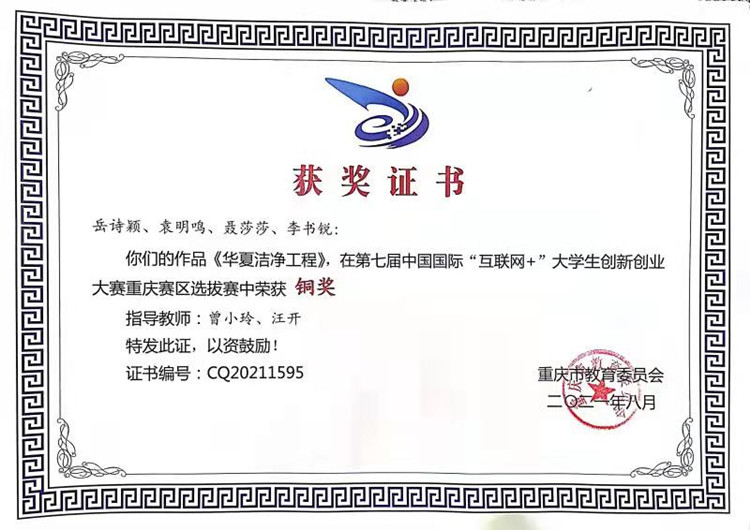 轨道交通学院学子在2021年第七届中国国际“互联网+”大学生创新创业大赛重庆赛区选拔赛中“华夏洁净工程”创新创业项目荣获“青年红色筑梦之旅”赛道铜奖。