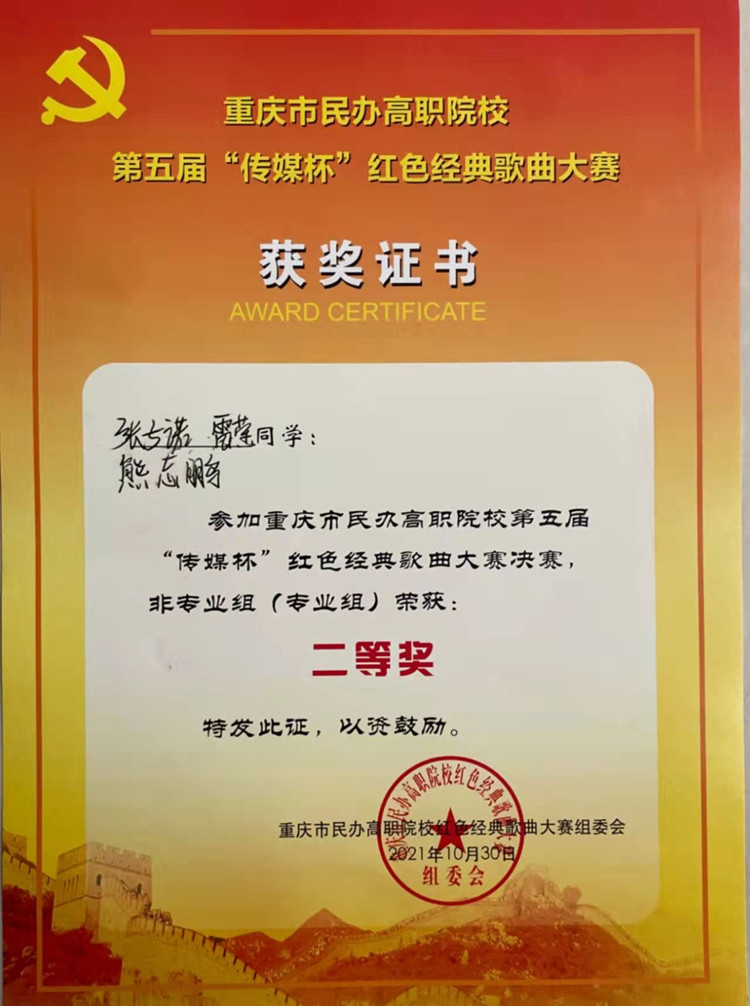 2021年10月30日,由重庆市民办教育协会高职专委会主办,重庆传媒职业学院承办的重庆市民办高职院校第五届“传媒杯”大学生红色经典歌曲歌手大赛决赛在重庆传媒职业学院举行,全市共17所高职院校参加比赛,beat3652支队伍进入决赛,由校团委副书记陈秋熙带队。