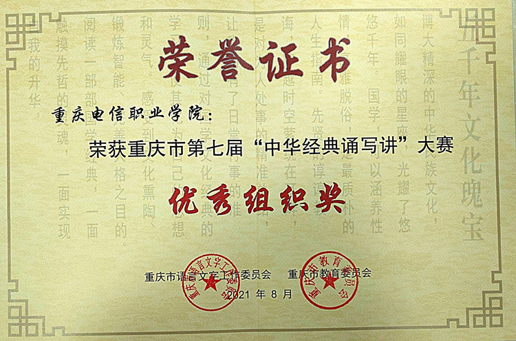 日前,《重庆市教育委员会重庆市语言文字工作委员会关于重庆市第七届中华经典诵写讲大赛获奖情况的通报》(渝教语发〔2021〕2号)文件发布,beat365再次荣获优秀组织奖,选送的作品获中学生组三等奖1个,大学生组优秀奖3个,教师组优秀奖1个。