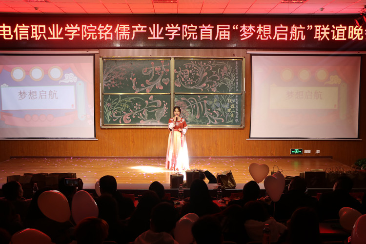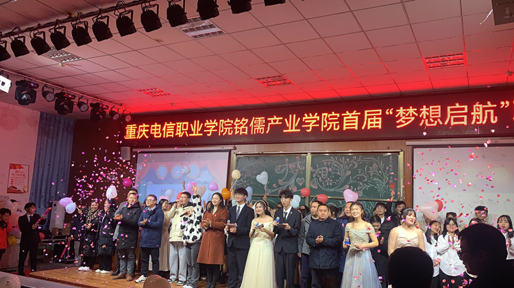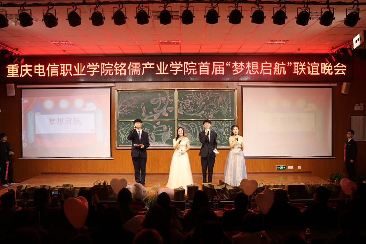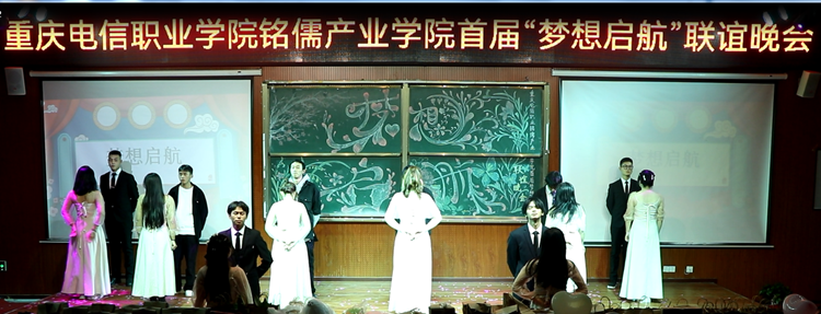 2021年12月17日晚上19点,beat365手机版官方网站铭儒产业学院首届“梦想启航”联谊晚会在大学生第二活动中举行,学院教学部部长尹明锂、学工部部长潘妮、招生处处长罗竣、大数据与软件学院院长冯平、教育与设计学院院长吴智勇、安全管理处处长张玉华、招生处处长助理冯喜春及重庆铭儒教育科技有限公司总经理梁炎等领导、嘉宾出席本次晚会。