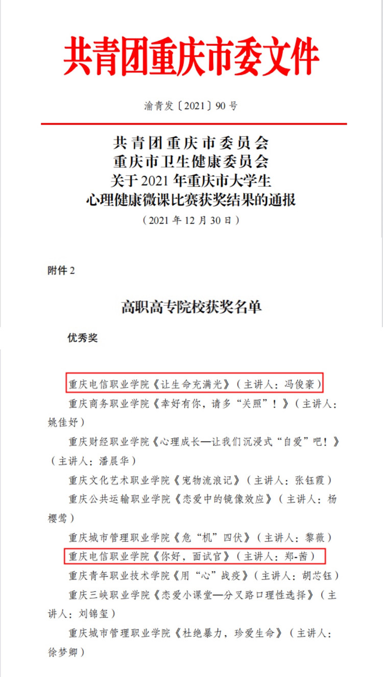 为持续加强对青年大学生的人文关怀和心理疏导,示范引导学生正确认识义和利、群和己、成和败、得和失,不断培育青年大学生自尊自信、理性平和、积极向上的健康心态。2021年11月,团市委、市卫生健康委以“关注心理健康 共筑美好未来”为主题,共同启动 2021 年重庆市大学生心理健康微课比赛。
