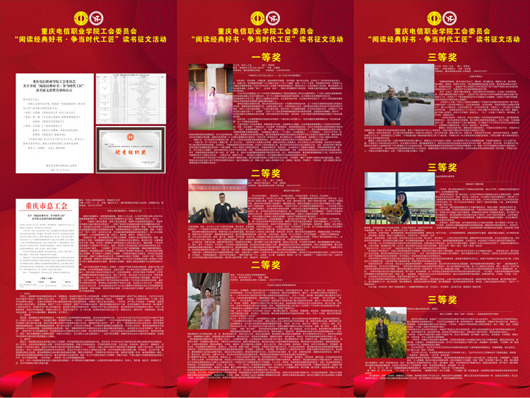 校工会于12月组织开展了“阅读经典好书·争当时代工匠”读书征文评选活动,收到来自七个工会的投稿28篇,最终6名教师的稿件脱颖而出获得表彰。在本次比赛期间,党委副书记、副校长代敏的征文《怀匠心育匠德践匠行,争做时代工匠》,在重庆市总工会读书征文活动评选中荣获全市二等奖。