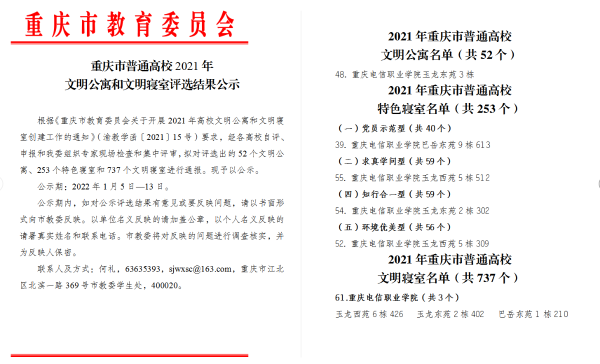 近日,重庆市教委发布《重庆市教育委员会关于2021年普通高校文明公寓和文明寝室评选结果的通知》【渝教学函〔2022〕2号】,beat365学生公寓三号楼获得重庆市普通高等教育学校“文明公寓”称号,4个学生寝室分别荣获环境优美型、党员示范型、知行合一型、求真学问型“特色寝室”称号,3个学生寝室荣获“文明寝室”称号。