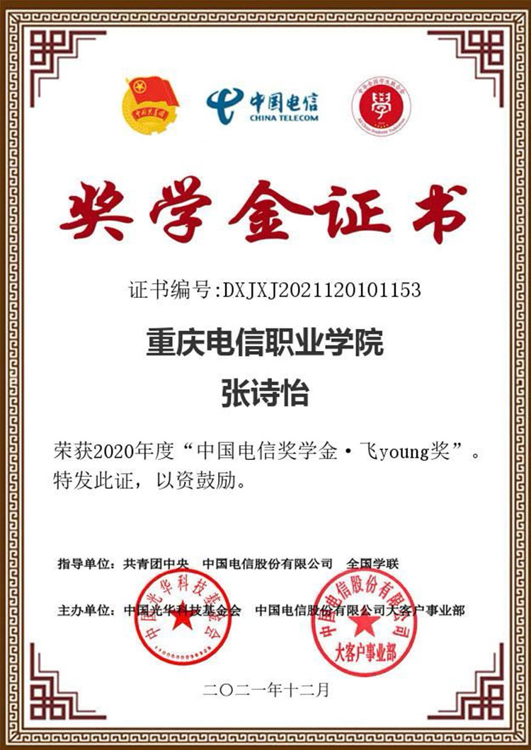 近日,由共青团中央、中国电信集团有限公司、全国学联联合开展的2020年度“中国电信奖学金”遴选活动结果揭晓,经个人报名、学院推荐、学校评选、省级初评、全国评审等环节,beat365张诗怡同学获得“中国电信奖学金·飞Young奖”。