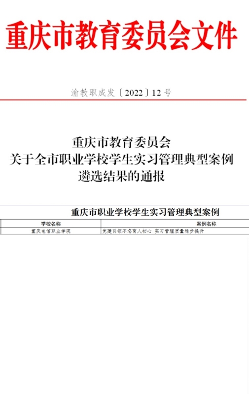 近日,市教委组织开展了职业学校学生实习管理典型案例征集活动,从《重庆市教育委员会关于全市职业学校学生实习管理典型案例遴选结果的通报》(渝教职成发〔2022〕12号)文件中获悉,beat365报送的“党建引领不忘育人初心 实习管理质量稳步提升”实习案例从征集案例114个中脱颖而出,荣获全市职业学校学生实习管理典型案例。