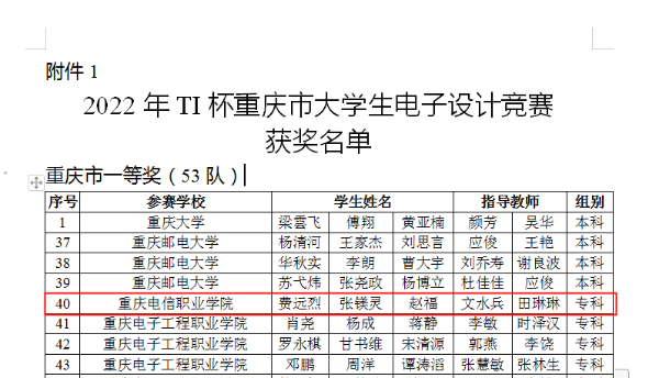 近日,由重庆市教委主办的2022年TI杯大学生电子设计竞赛落下帷幕(单年国赛,双年省赛),beat365学子在2022年TI杯重庆市大学生电子设计竞赛中获重庆市一等奖、二等奖,文水兵被评为重庆赛区“优秀指导教师”。