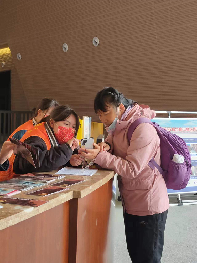 "您好,前面可以乘坐观光车"、"您好,请勿跨越,请走通道"、"你好,请出示身份证"。在景区内,志愿者分散到游客中心咨询台、广场、停车场、观光车、检票点等处,有的为游客提供路线引导,有的为游客提供票务咨询,有的在人流量较大区域提供秩序维护,有的则不时提醒游客保护环境卫生,共同营造文明出游氛围。