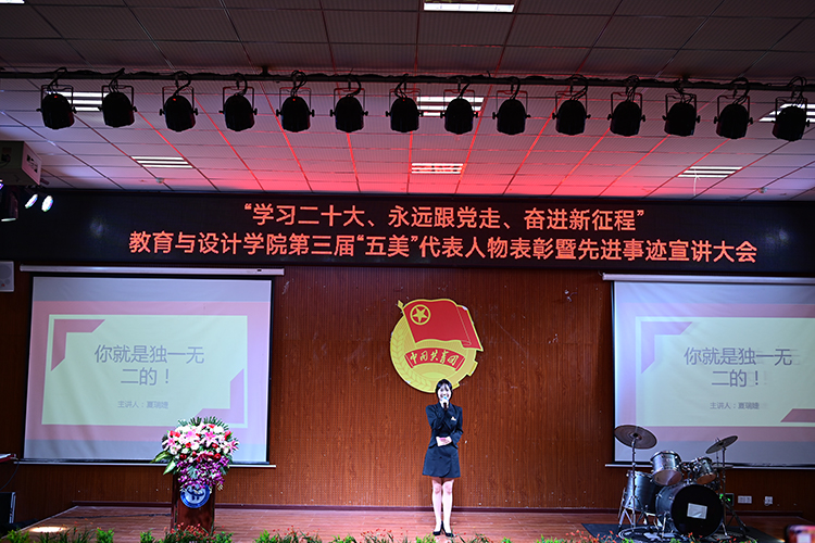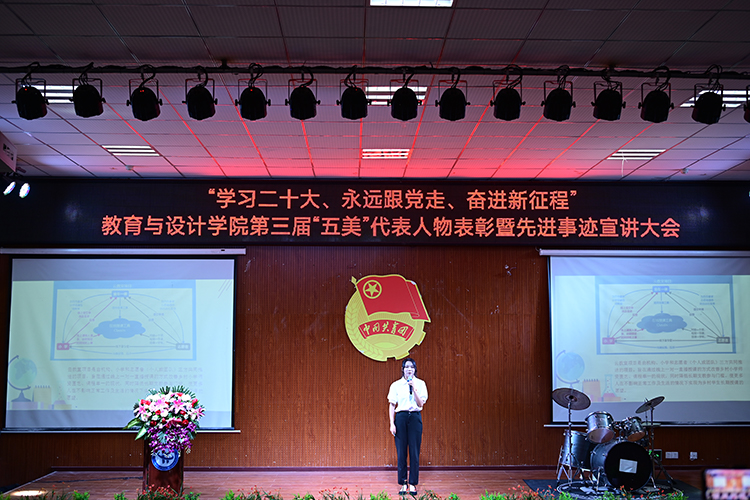 为全方位塑造培养德、智、体、美、劳全面发展的时代新人,打造教育与设计学院“五美”育人文化特色体系,树立青年榜样力量,激发青年自我奋斗精神。6月13日晚上19:00,教育与设计学院在博学楼一阶隆重举行了“学习二十大、永远跟党走、奋进新征程”第三届“五美”代表人物表彰暨先进事迹宣讲大会。