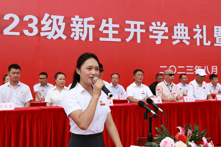 2023级新生代表教育与设计学院钟雯雯同学发言,她表示全体参训学生将做到在军训中锤炼意志品质,练就过硬本领,展现最优秀的自己;继承军队优良传统,发扬亮剑精神,以高昂的热情和刻苦的训练锻炼自己;严守军训纪律,培养优秀品质,用青春告白祖国,用奋斗书写人生。