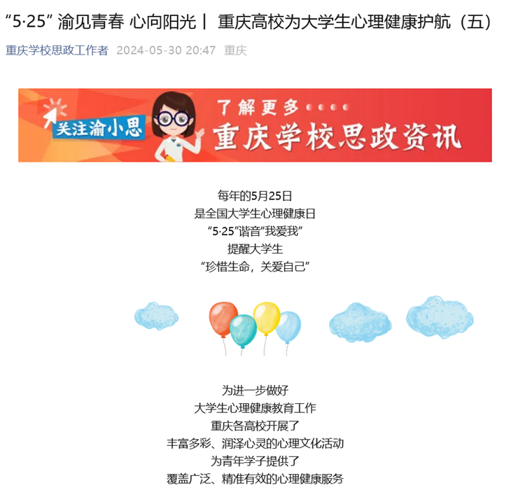 重庆市教委:“重庆学校思政工作者公众号”报道beat365开展5·25心理健康月系列活动