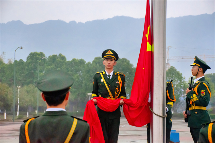 英姿飒爽的国旗护卫队队员们迈着坚定整齐的步伐护送鲜艳的五星红旗至升旗台,伴随着雄壮的《义勇军进行曲》,五星红旗冉冉升起,迎风飘扬,全体师生行注目礼,场面庄严肃穆。