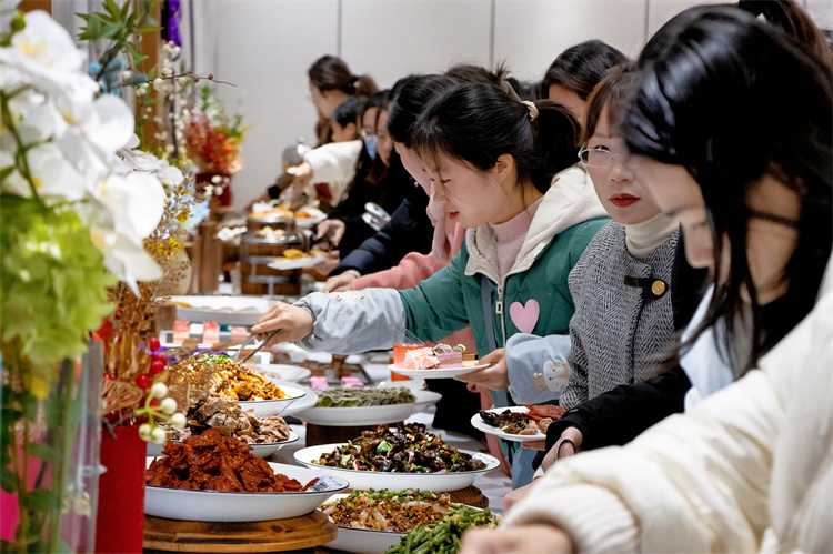 曹继建向全校女同胞们致以节日的美好祝福和诚挚问候,充分肯定了女教职工在学校事业发展中“半边天”的作用。他还表示“今天女性是文化传承的中坚力量,时代在变,但‘她力量’始终熠熠生辉,感谢女教职工们以巧手守护非遗根脉,为校园增添文化温度。”